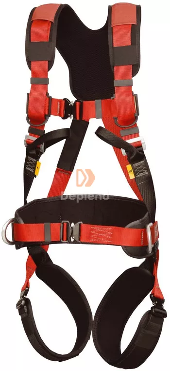 45 mm széles poliamid alapanyagú állítható váll-, combhevederek, teljes biztonsági mellheveder, két mellső hevederhurkos, egy hátsó alu fémgyűrűs felfüggesztési pont, munkahelyzet beállító deréköv állítható méretben, két fémgyűrűs bekötési ponttal, lapocka és mellrész közti széles szivacsbetét, párnázott deréköv és combhevederek a kényelmes munkavégzéshez, gyorscsatos záródás a vastag, biztonsági mellhevedernél, valamint a hasnál és comboknál is, terhelhetősége 15 kN
