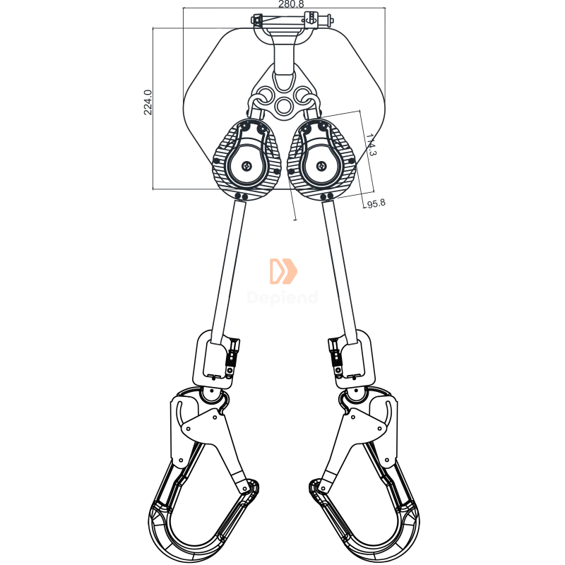 Maximális hosszúság: 2,40 m. Heveder szélessége: 21 mm. Heveder anyaga: Poliamid. Súly: 2,95 kg. Minimális szakítószilárdság: > 15 kN. Csatlakozók: 1 db FA 20 502 00A acél kettős működésű karabiner és 2 db FA 50 227 60 alumínium betonacél horog nyitható zárószemmel és forgóval. Max. 140 kg súlyú felhasználók számára jóváhagyva függőleges és vízszintes használatra, 2. terhelési faktorban is használható. SPILO-S2 heveder, Nagy ütésállóságú polimer burkolat, szinte elpusztíthatatlan, de ugyanakkor kompakt és könnyű. Minden blokk tetején forgópánt található. A hátsó zsebben külső energiaelnyelő található.