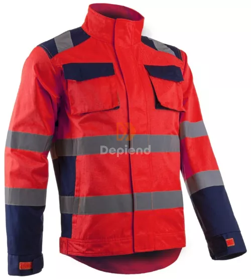 5 cm széles fényvisszaverő csíkokkal, hosszított hátrészű jólláthatósági munkakabát. Állig érő húzózár tépőzáras cipzárfedővel, magas, álló gallérral és tépőzárral állítható mandzsetta.