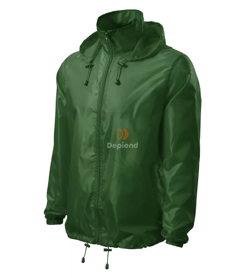 Könnyű szélálló anyaggal, teljes hosszúságú cipzárral, a gallérban rejtett elasztikus húzózsinóros kapucnival, elasztikus húzózsinóros alsó szegéllyel, rejtett zsebekkel és szőtt címkével rendelkező dzseki, amely könnyen hordozható és különálló kis tasakba hajtogatható.