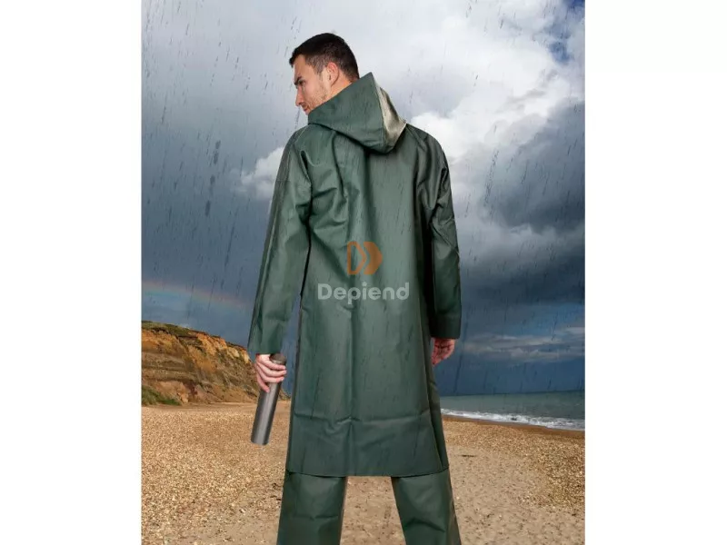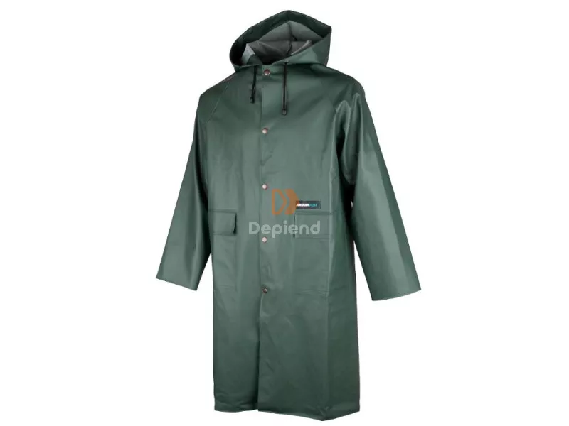 Plavitex vízálló anyagból készült nyomógombos záródással, kapucnival és két fedett zsebbel rendelkező vízálló esőkabát, amely varratainak kettős ragasztása véd a heves esőtől és a széltől.