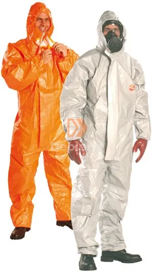 poliészter filmréteggel (118 g/m2), véd bármely szemcsenagyságú por és radioaktív részecskék ellen, 5 bar nyomásig ellenáll nagy koncentrációjú szervetlen, valamint számos szerves fröccsenő vegyszereknek, olajoknak, kenőanyagoknak, oldószereknek, 480 percig véd pl. 98% kénsav, 70% salétromsav, 40% sósav, dízelolaj, benzin, kerozin, toluol, metanol, klórbenzol, hexán, aceton és 50% nátriumhidroxid ellen, biológiai védelem mikroorganizmusok és vér ellen, folyékony permetekkel szemben zárt, belső oldalán antisztatizált, külső oldalához megfelelő földelés kell, 237 μm vastag, mégis rendkívüli kopásállóságú és szakítószilárdságú, hajlékonyság -73°C-ig,gumizott derék-, arc-, csukló- és bokarész, dupla cipzárfedél öntapadós ragasztószalaggal, biztonsági szalagok a varratok mentén, a ruhaujj felcsúszását megakadályozó rugalmas hüvelykujjakasztó, rendkívül könnyű (430-470 gramm), légzésvédő teljesálarcra illeszkedő kapucni, szálmentes anyag, III. védelmi kategória, 3., 4., 5. és 6. típus