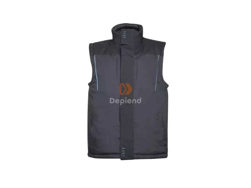 Formatervezett mellény kontrasztos varrással. Két mellzseb és két alsó zseb fényvisszaverő szegély a jó láthatóság érdekében. Szigetelés 100 % poliészter, 200 g/m² valamint rugalmas karkivágás.