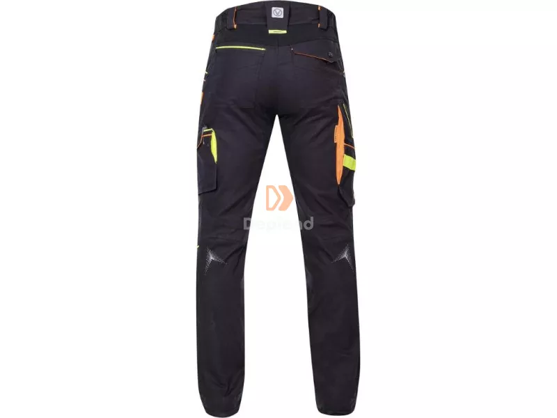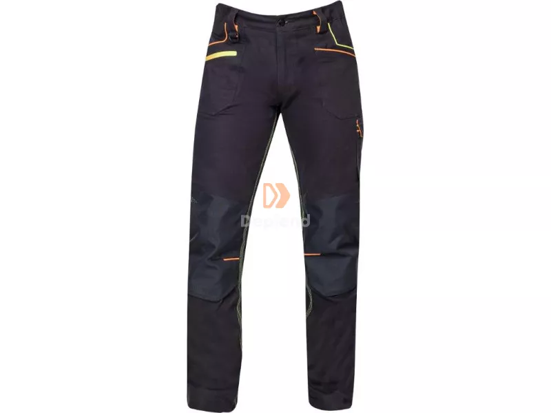 Speciális Amalytton anyagból készült, derékig nyújtható pamut derék nadrág, amely megnövelt szilárdságával és sima, puha felületével tűnik ki. Tartós és elasztikus Tabiflex anyagot használ. A nadrág rendkívül funkcionális és ergonomikus 3D SLIM FIT szabással rendelkezik. A térdrész strapabíró Oxford anyaggal van megerősítve, vízlepergető kezeléssel és egy zseb a térdvédők számára rendelkezik. A nadrág ezen kívül rendelkezik elasztikus derékgallérral, rejtett hátsó dupla övhurokkal, belső csúszásgátló szalaggal, D-gyűrűvel a karabinerhez, 2 tapintható zsebbel, 1 elülső cipzáras zsebbel és 1 elülső szerszámzsebbel széles hurokkal. A jobb lábon többfunkciós zseb található egy összecsukható mérőszalagnak, egy csavarhúzónak és egy széles hurkú vágókésnek, a bal lábon pedig egy nagy dupla zseb található, amely nyomótalppal fedett, és háromszoros varrású. A hátsó részt egy nyereg és 2 zseb tagolja, a jobb hátsó zsebet egy nyomótalp fedi. A lábak alsó szegélye Oxford anyaggal megerősített, mely kopásálló. A jobb láthatóságot a dinamikus fényvisszaverő 3D-nyomatok és a hi-vis kiegészítők biztosítják. A lábak hossza könnyen meghosszabbítható 5 cm-rel.