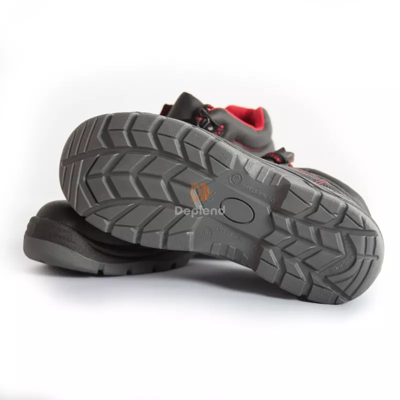 Csúszásgátló PU/PU, olaj-, zsír- és benzinálló antisztatikus külső talppal (ütéscsillapítóval), kivehető talpbetéttel, hátul légáteresztő textil béléssel, párnázott bokarésszel, rozsdamentes acél kaplival, a sarokrészen fényvisszaverő csíkokkal, piros színű belső béléssel és CE tanúsítvánnyal rendelkező munkavédelmi bakancs.