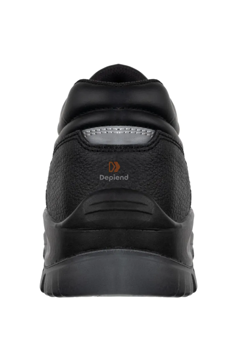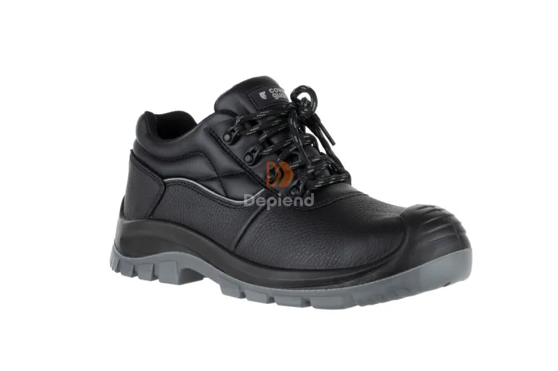 Vízlepergető korrigált bőr felsőrésszel, PU orrborítással, olajálló, kétrétegű és antisztatikus PU talppal, emelt színtű csúszásbiztossággal, kompozit műanyag lábujjvédővel, textil talplemezzel, szivacsos bokarésszel és nyelvvel, páraáteresztő, lélegző és nemszőtt béléssel, ütődéselnyelő sarokrésszel és a sarkán fényvisszaverő díszcsíkkal rendelkező teljesen fémmentes munkavédelmi cipő.