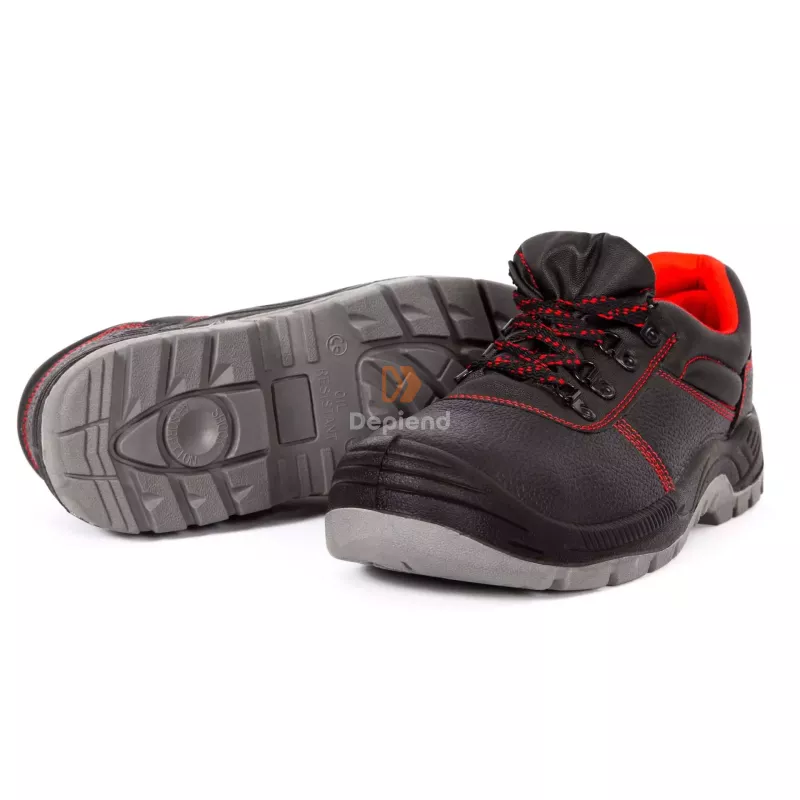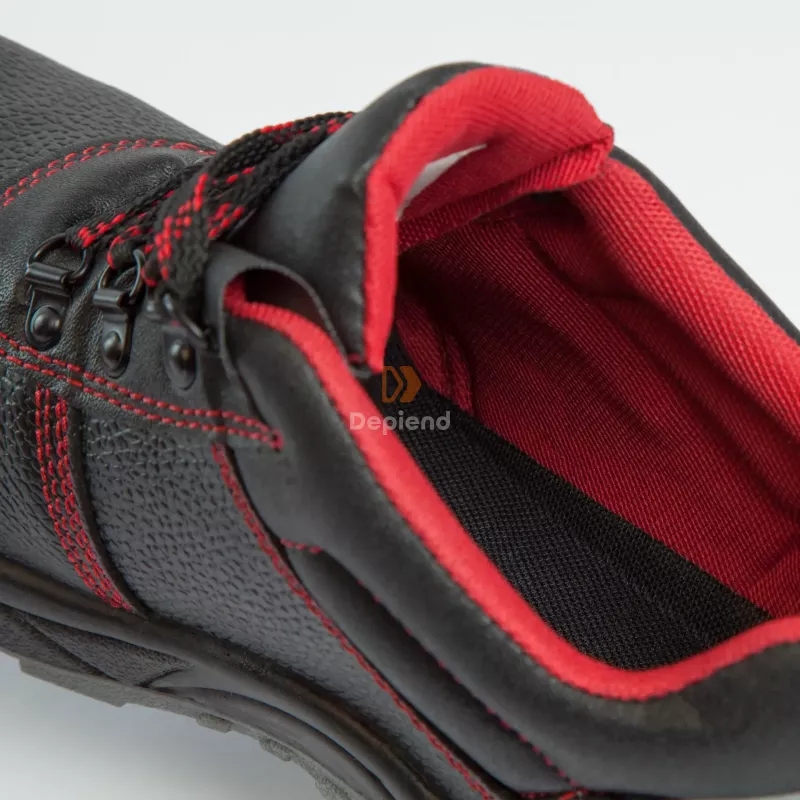 Csúszásgátló PU/PU, olaj-, zsír- és benzinálló antisztatikus külső talppal (ütéscsillapítóval), kivehető talpbetéttel, hátul légáteresztő textil béléssel, párnázott bokarésszel, rozsdamentes acél kaplival, a sarokrészen fényvisszaverő csíkokkal, piros színű belső béléssel és CE tanúsítvánnyal rendelkező munkavédelmi cipő.