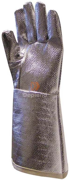 38 cm-es mandzsettával,, aluminizált kesztyű 350 g/m2-es hő- és vágásbiztos aramidszálon, védelmi szint: AB2C2E3, véd sugárzó- (20 kW/m² > 150 sec) és kontakt (250°C >15 sec) hőhatás, valamint közvetlen lánghatás (>7 sec) ellen, forró fémcseppek elleni védelem hegesztő munkálatoknál