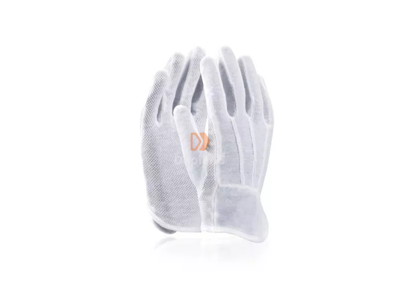 A kézfejen PVC pöttyökkel rendelkező pamut/poliészter kesztyű, amely száraz környezetben való munkavégzésre ajánlott. Az XS, S, L, XL és 2XL méretek csomagolása 300/12, az M méret csomagolása 600/12.