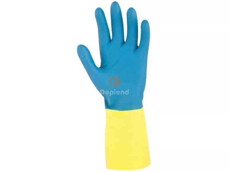 Latex kesztyű, amely 0,70 mm tenyérvastagsággal, 100% velúr pamut belsővel és kloroprén külső réteggel rendelkezik, kémiailag nagyon ellenálló, az olajok előfordulásával való környezetben végzett munkavégzésre ajánlott és 300 mm hosszú.