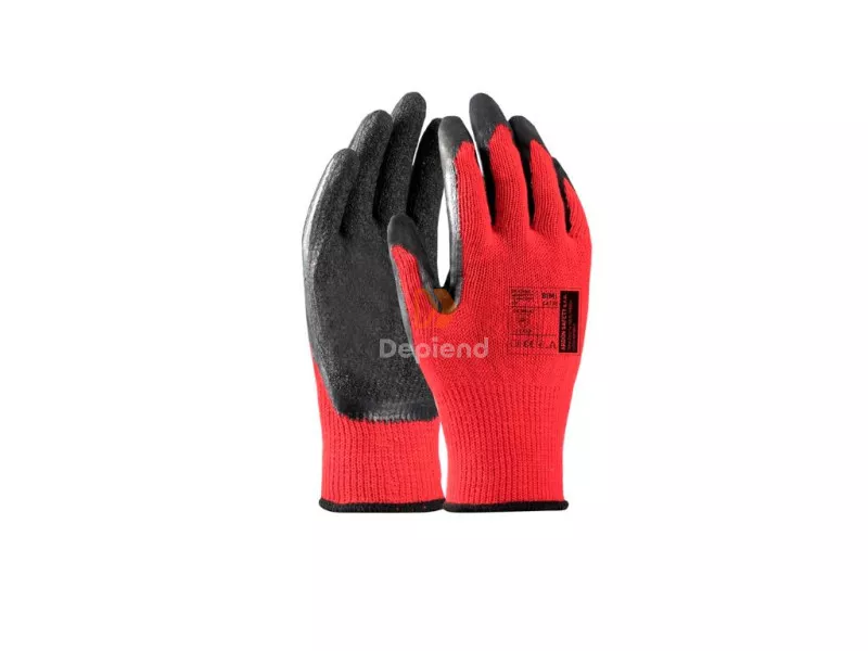 Latexba félig mártott poliészter/pamut kesztyű, amely száraz környezetben való munkavégzésre ajánlott.