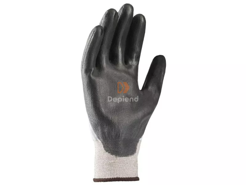 Félig poliuretánba mártott vágásálló nejlon kesztyű, amely kényelmes és száraz környezetben való munkavégzésre ajánlott.