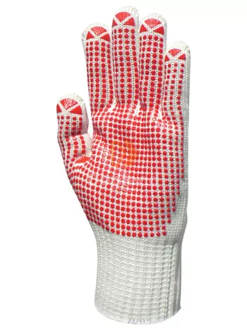 kötött kilencszálas, kívül poliamid, belül kényelmes pamut, vastag, 7-es kötésű, kopásálló védőkesztyű nagy mechanikai igénybevételre, tenyerén nem gömbölyű, hanem tetejükön lapított, megnövelt felületű csúszás elleni piros pöttyök