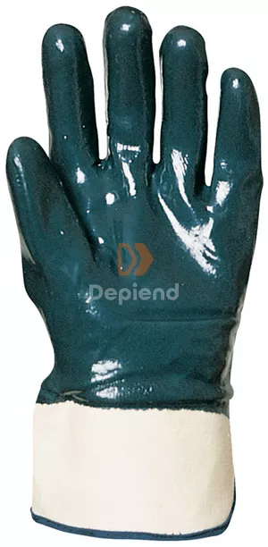 Pamutra csuklóig kétszer mártott kék nitril, mártott kézhát, merev, biztonsági mandzsetta, nedves körülmények közt is használható Ecoline® változat mechanikai ártalmak ellen.