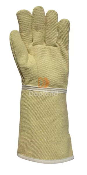 350 g/m2 vastag, hőálló, szövött para-aramid, belül teljes hosszában hőszigetelő, komfortos pamutbélés, 250°C kontakt hőhatásnál 15 sec. időtartamig nyújt védelmet, nagy szakítószilárdságúanyag, mely véd olvadt fémcseppek ellen is,öt ujjas változat