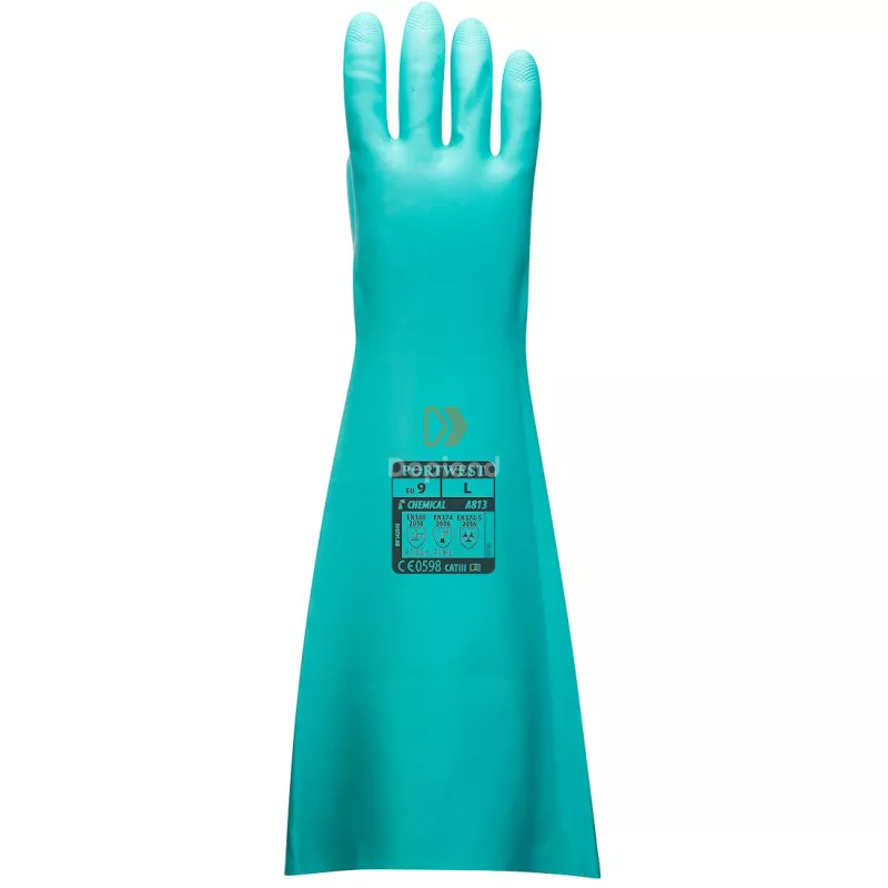 Extra hosszú 48 cm-es vegyszerálló kesztyű kiválló védelmet nyújt számos oldószer ellen. A csúszásgátló mintázat kiváló tapadást biztosít száraz és nedves körülmények között. A 0,55 mm-es vastagság kiváló kopásállóságot biztosít. Alkalmas számos iparágra például ipari karbantartásra, tengeri fúrásra, nyomdai munkára és vegyi anyagok ellen. CE minősítés. Élelmiszer feldolgozás. Kisker csomagolás. 100% latexmentes. CE-CAT III. Vegyszerálló hosszúszárú kesztyű. Olaj- élelmiszer- és vegyipar. Élelmiszerrel érintkezhet. Szilikonmentes.