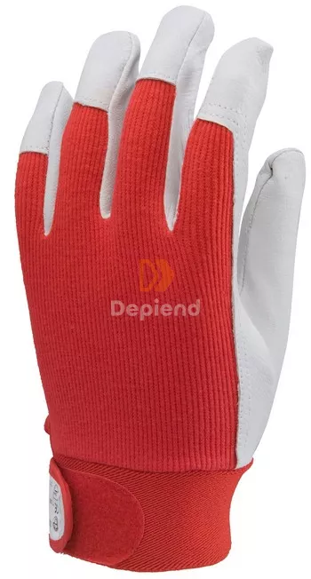 puha színsertésbőr sofőrkesztyű, artéria- és körömvédő, tartós, puha, piros pamut kézhát, piros csíkos, tépőzárral állítható rugalmas csuklórész, finom munkákra is használható komfortosvédőkesztyű