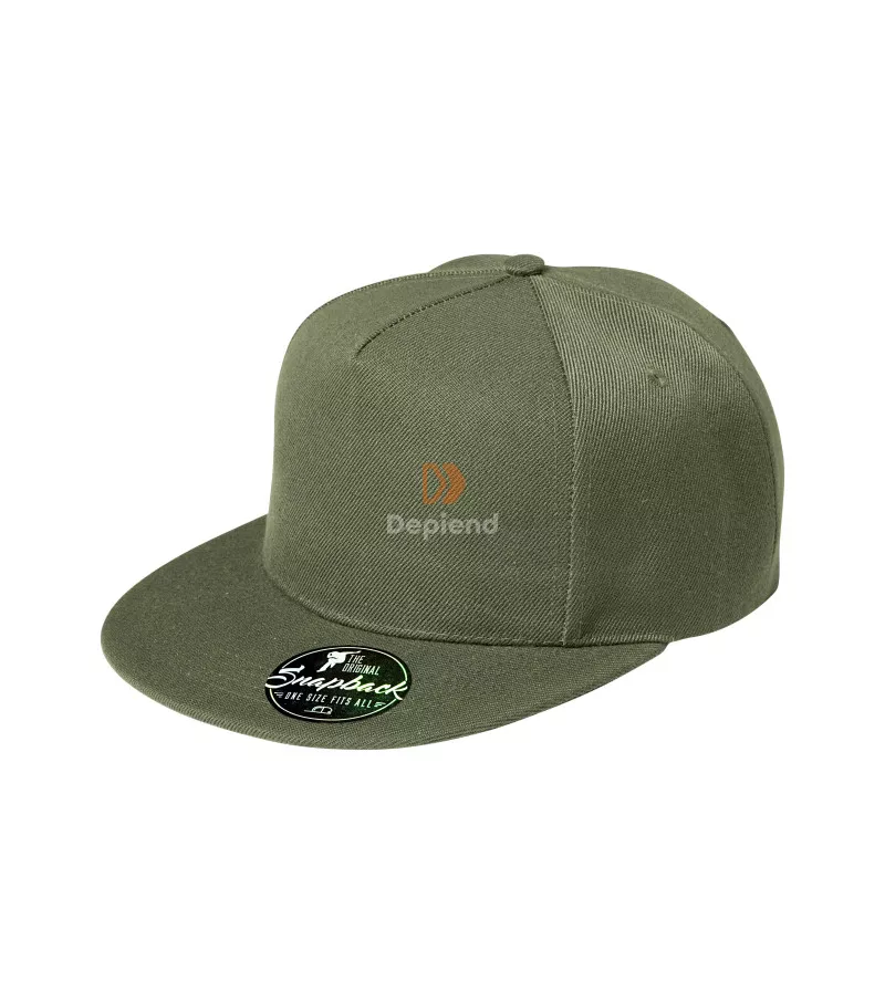 Ötpaneles szabással, összekapcsolt első panellal, varrott lapos felső résszel, hímzett légáteresztő lyukakkal, nedvszívó pánttal, műanyag patent gombokkal állítható mérettel és a felső részen szatén anyagú eltávolítható címkével rendelkező sapka napellenzővel.