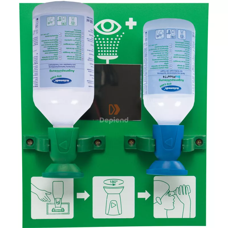 Szemkimosó állomás két palackkal, fali tartóval. Használatra kész, steril palackok, ergonomikus öblítőfejjel és porvédő kupakkal. Piktogramos használati utasítás táblával és tükörrel a könnyű kezelhetőség érdekében. Rögzítéshez szükséges csavarokkal + sürgősségi szembaleseti tervvel. 1 x 500 ml 0.9% nátrium-klorid oldattal + 1 x 250 ml BioPhos®74 foszfát-puffer oldattal. Öblítési idő: nátrium-klorid oldat kb. 5 perc, BioPhos®74 kb. 2.5 perc. Eltarthatóság: 3 év.Tartalom:1 x 500 ml steril 0.9% nátrium-klorid oldat + 1 x 250 ml steril BioPhos®74 4.9% foszfát-puffer oldat