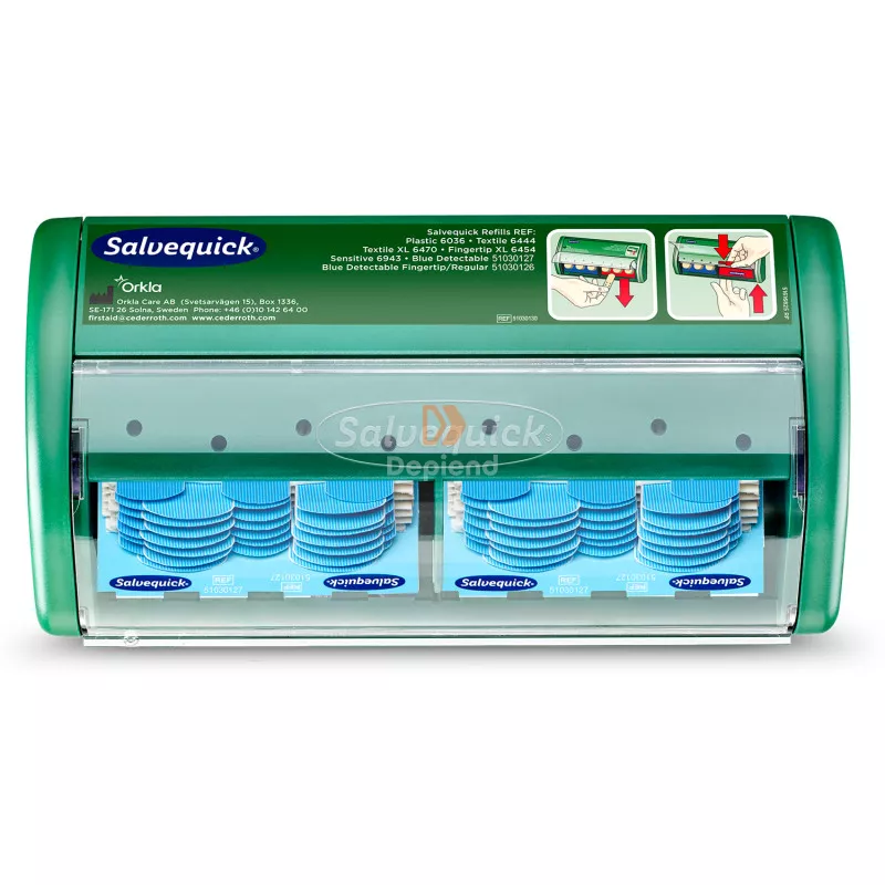 Kifejezetten éttermi és élelmiszeripari felhasználásra alkalmas sebtapasz adagoló. A Salvequick sebtapasz adagoló magas minőséget biztosít és egyszerűen használható. Egy kézzel használható – kihúzáskor a sebtapasz egyik ragasztófelülete automatikusan szabaddá válik, így azonnal könnyen felhelyezhető. Az átlátszó fedél védi a sebtapaszokat a portól és nedvességtől. Az adagoló a speciális kulccsal gyorsan és egyszerűen újratölthető. Minden sebtapasz vízálló. 2x 35 db Salvequick kék detektálható sebtapasszal.