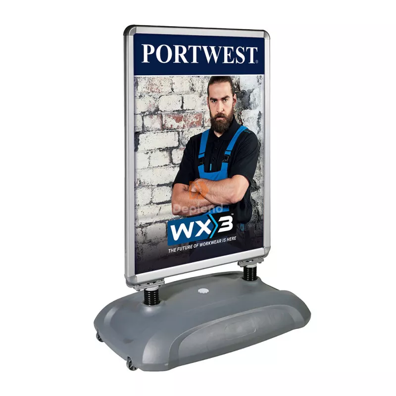 Ez a robusztus megállító tábla kerekekkel és diszkrét fogantyúval rendelkezik. Vízzel vagy homokkal tölthető. Erős rugókkal és merev hátoldallal hogy minden időjárási körülmény között használható legyen. Két PVC UV álló poszterfedelet tartalmaz. Egyszerű módja annak hogy növeljék az értékesítést és a márka ismertségét. Könnyű és masszív Vízálló és könnyen tisztítható Könnyen felismerhető és növeli a márka ismertségét