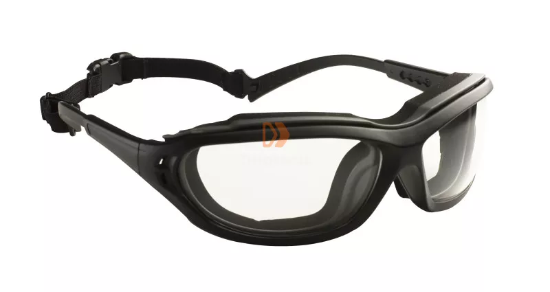 Fekete nylon (F) keret kivehető EVA szivacsbéléssel, víztiszta, páramentes 2,3 mm vastag polikarbonát lencse (2-1,2 1FN, fényszűrő osztály: 0), poliamid (nylon) állítható hosszúságú szárak, végükre pattintható rugalmas, csatos szárösszekötő gumipánttal.