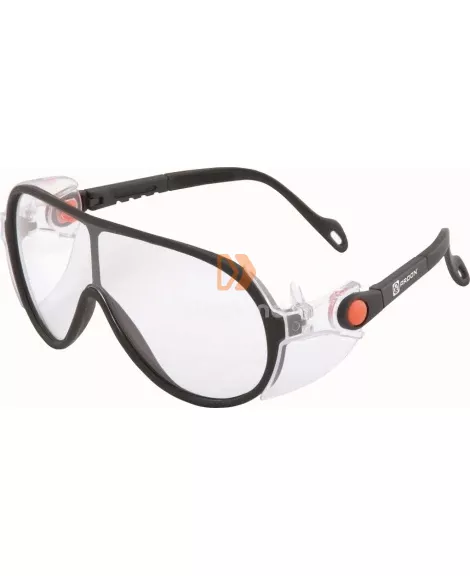 Magas fokú védelmet nyújtó védőszemüveg, amely tökéletesen illeszkednek bármilyen arcformához, integrált oldalburkolatokkal, 4 pozícióba állítható oldalhossszal és állítható oldaldőléssel rendelkezik. A szemüveg ezen felül UV szűrős, páramentesítő kezelést és karcolásgátló kezelést kapott. A lencse jelölése 2 - 1,2 1 FT O.